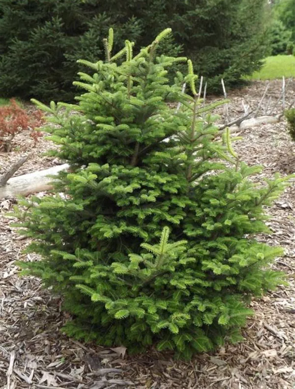 - Лучший вариант мульчи – перекомпостированная сосновая кора, без мусора, веточек. Слой мульчи должен иметь толщину 5-8 см. Кора сосны поможет поддерживать правильный уровень pH для пихты.