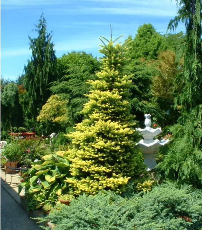 - «Голден Глоу» Golden Glow – сорт с конусообразной формой кроны, иголки желтые. В саду создаст интересный цветовой акцент.