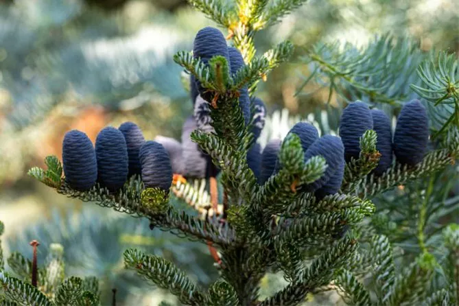 - Плоды – шишки до 7 см длиной, с пурпурным налетом, по форме цилиндрические. Шишки сначала фиолетово-голубые или пурпурно-фиолетовые, со временем становятся зеленовато-коричневыми. Появляются шишки на ветвях через несколько лет после посадки дерева, они жесткие, вертикально направленные вверх, появляются даже на деревьях метровой высоты. При созревании разваливаются.