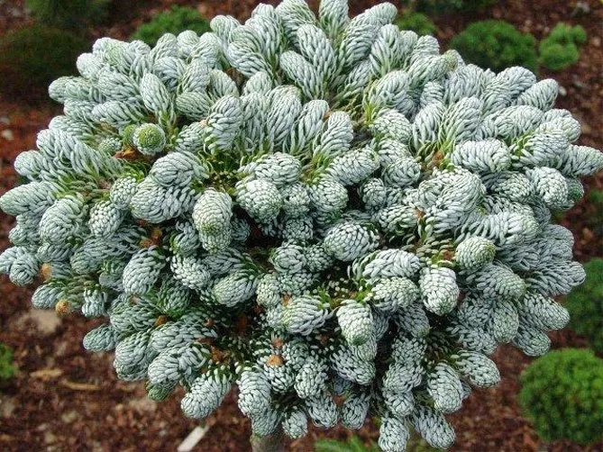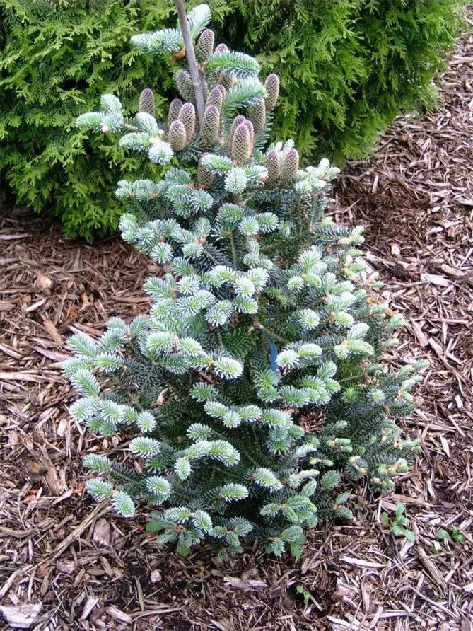 - «АйсБрэйкер» IceBreaker – сорт медленнорастущей пихты высотой 40-50 см, достигает аналогичного диаметра, вырастает всего на 3-4 см в год. Молодые побеги на начальной стадии развития имеют сочный зеленый цвет. По сравнению с темно-зеленым и серебристым цветом старых побегов молодые бутоны выглядят феноменально. Хвоя короткая, до 1,5 см длиной и 2-3 мм шириной, толстая, цилиндрическая, закручена вокруг побегов, с белой нижней стороной. Верхняя часть хвои светло-зеленая, почти незаметна. Требуется плодородная почва с умеренным увлажнением и кислой или слабокислой реакцией. Высаживаем в солнечные или полутенистые места, защищенные от ветра. Подходит для альпинариев, выращивания в контейнерах. Полностью морозоустойчивое дерево.