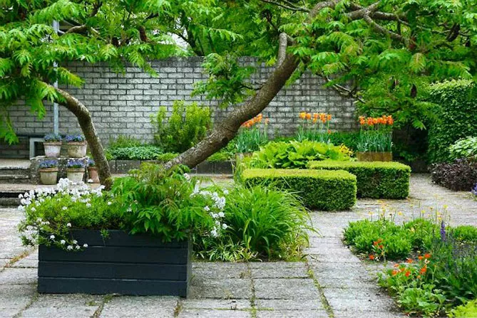 Стиль включает правильные геометрические формы планировки, дорожки расположены в виде геометрических линий: