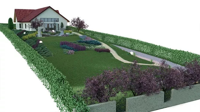 Функциональные зоны, делящие продолговатый участок, желательно разделять элементами ландшафтного дизайна: