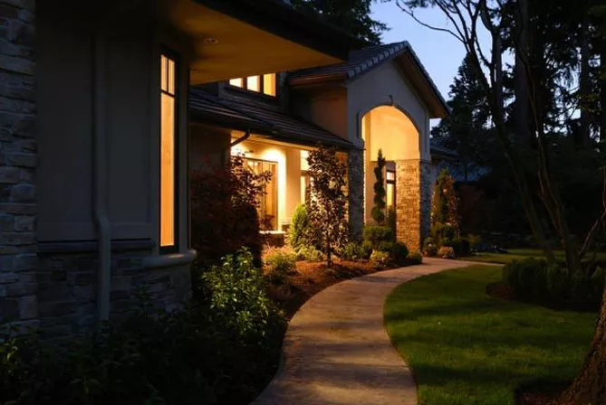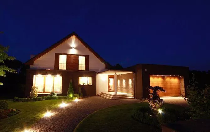 Фасадное освещение несет декоративную функцию (свет, направленный параллельно стене, прекрасно подчеркивает структуру декоративного камня, кирпича). Для освещения используют: