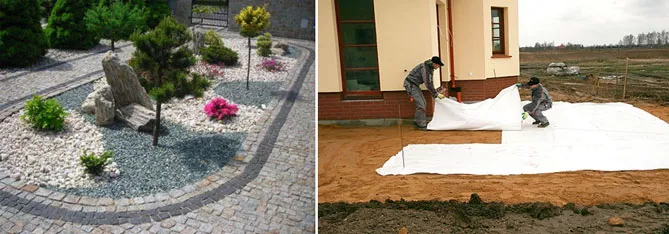 - Сорняки на лужайке. Укладка геотекстиля на землю, нанесение толстым слоем садовой коры, декоративного базальтового песка, белого камня поможет ограничить прополку, полив сада (почва будет высыхать медленнее).