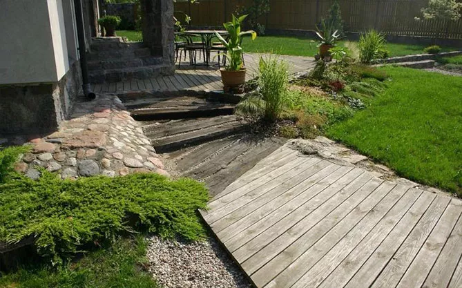Практичное решение – выбор материалов с грубой, нескользящей поверхностью. Древесина и базальт становятся скользкими после дождя.
