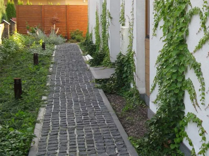 - небольшие узкие участки оптически расширяют элементы с поперечной траекторией, например, горизонтальные плитки тротуара;