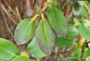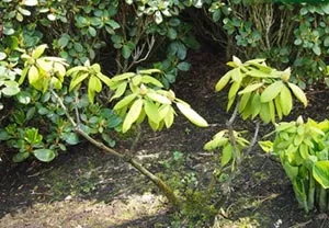 Симптомы фитофторы появляются на кончиках побегов рододендронов и других представителей семейства вересковых (Ericaceae). Болезнь развивается при избытке влаги в почве.