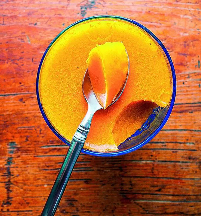- Мякоть смешиваем миксером с растительным маслом (подсолнечное, миндальное) — 2 части масла на 3 части мякоти.