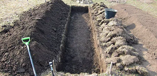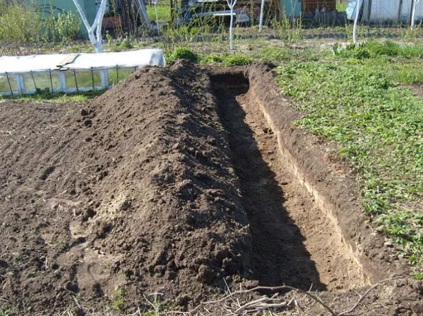 - В каждую траншею закладывают десятисантиметровый слой влажного сена, присыпают сверху навозом.