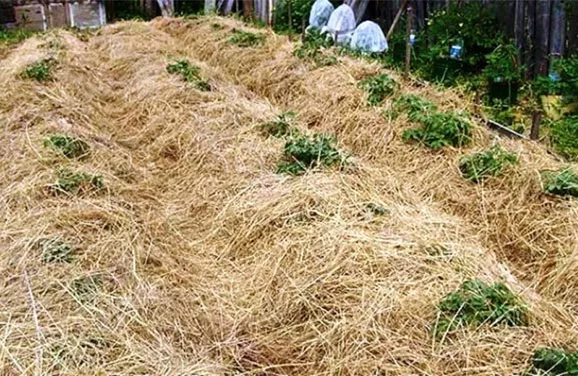 - По мере роста побегов, требуется 3-4 раза мульчировать картофель двенадцатисантиметровым слоем соломы. Чтобы ветер не уносил солому, её сверху накрывают лутрасилом.