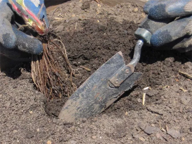 - Сначала выкапывают ямки, достаточно глубокие, чтобы вместить всю корневую систему. Корни не должны быть свернуты, и при необходимости их укорачивают острыми ножницами.