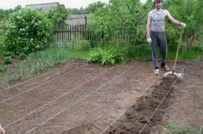 - Удобно проводить посадку усов клубники вдоль натянутых нитей, очерчивающих ряды.
