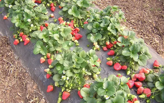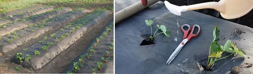 Клубнику часто садят под черный укрывной материал. Преимущества этого способа посадки растений клубники включают: снижение зараженности сорняками, поддержание влажности почвы, ускорение созревания и улучшение качества плодов. Этот метод выращивания рекомендуется на коммерческих и небольших любительских плантациях.