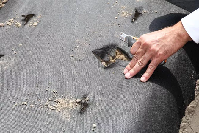 - Покрывают саженцы почвой, разравнивают, удаляют излишки грунта под поверхностью материала.