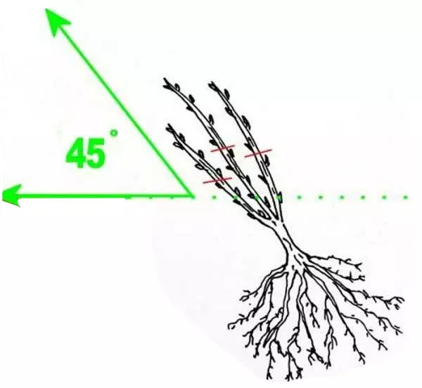 - Саженец устанавливают в центре под углом 45° или меньше. Так образуется больше придаточных корней, куст лучше питается, формирует много толстых боковых побегов.