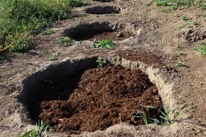 Ямы на 2/3 заполняют питательной смесью и поливают, чтобы почва быстрее просела. Оставляют до момента посадки.