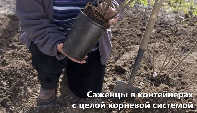 Контейнерные растения на участке размещают весь сезон, только на юге не следует этого делать в сильную жару. Саженец аккуратно достают из емкости, стараясь не тревожить земляной ком. Устанавливают в центре ямы так, чтобы корневая шейка была опущена на нужную глубину. Далее все, как описано выше.