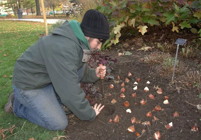- Луковичные растения удобно сажать в землю специальной сеялкой для луковиц, позволяющей сделать правильное отверстие в земле. Благодаря приспособлению можно быстро выкопать ямку с прямыми стенками, без необходимости копать вокруг. Благодаря уровню, отмеченному на устройстве, можно вырыть отверстие определенной глубины.