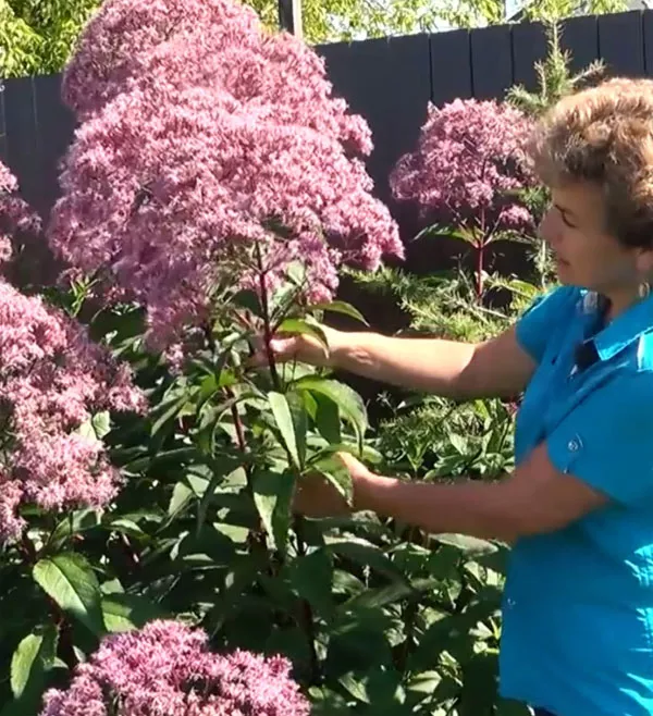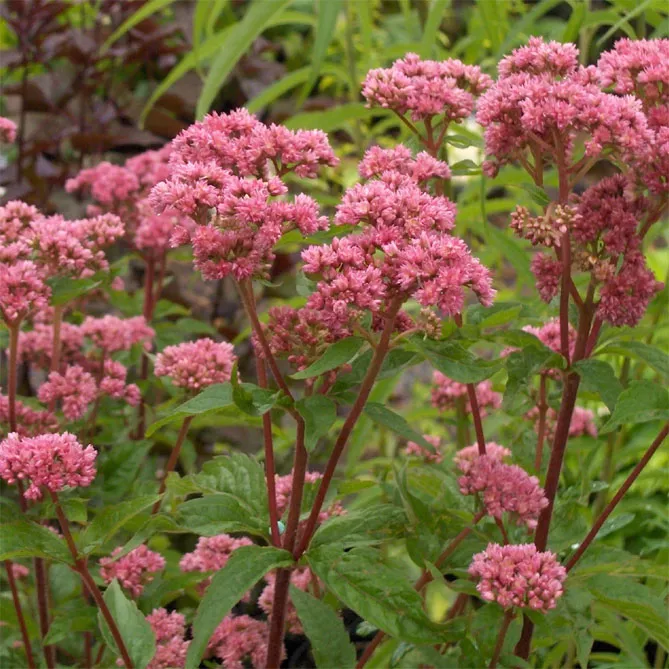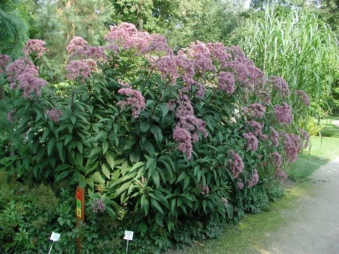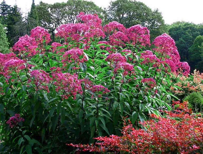 - Посконник пятнистый «Атропурпуреум» – самый популярный сорт с пурпурно-красными побегами и вишневыми цветами.