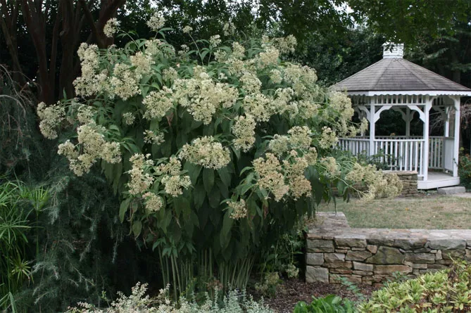 Вид Eupatorium ligustrinum – Конопляник бирючиновый – вечнозеленый кустарник с густыми веточками, достигающий значительных размеров – до 5 м в высоту и 3 м в ширину. Осенью цветет кремово-белыми или розовыми цветами, образуя ароматные соцветия диаметром 20 см. Листья эллиптические, зеленые, длиной 10 см.