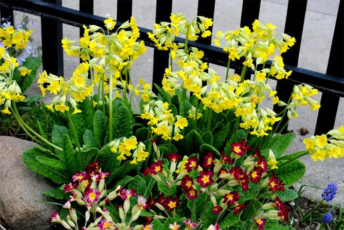 Первоцветы могут быть частью крупной цветочной композиции в сочетании с другими растениями. Как ранние весенние цветы, примулу садят с луковичными, цветущими в марте-апреле (гиацинты, крокусы). Такие композиции выглядят веселыми, пестря всеми цветами радуги.