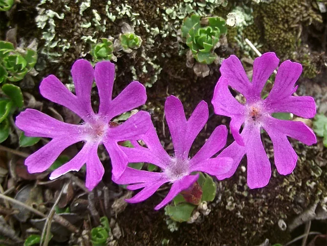 Высокогорное растение маленький первоцвет встречается в Альпах, Пиренеях, Апеннинах. Растет на кислых гранитных почвах, каменных террасах, каменистых осыпях и травянистых склонах. Создает короткий стебель (около 1 см). Крепкие, темно-зеленые листья, вытянуты наружу, с 3 зубцами сверху, мясистые, блестящие. Цветки колокольчатые, фиолетовые, растут индивидуально. Благодаря сильной корневой системе растение устойчиво к низким температурам, высушиванию ветром.