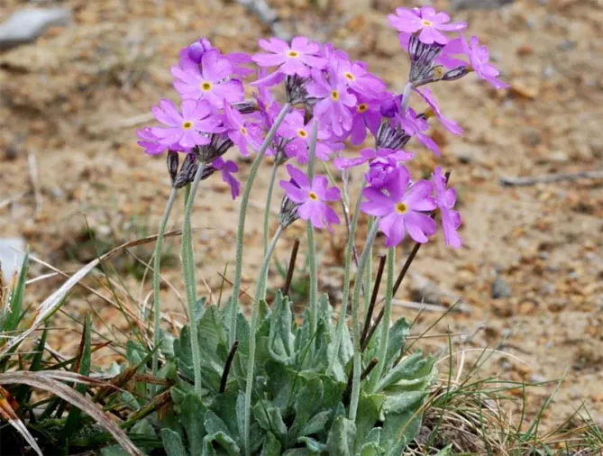 Многолетняя мучнистая примула в диком состоянии встречается в горах Южной Америки, Евразии. Вырастает до высоты 30 см. Листья мшистые снизу, снаружи с характерной центральной жилкой, без сетки прожилок. Цветы розового цвета. Цветение: май-сентябрь.
