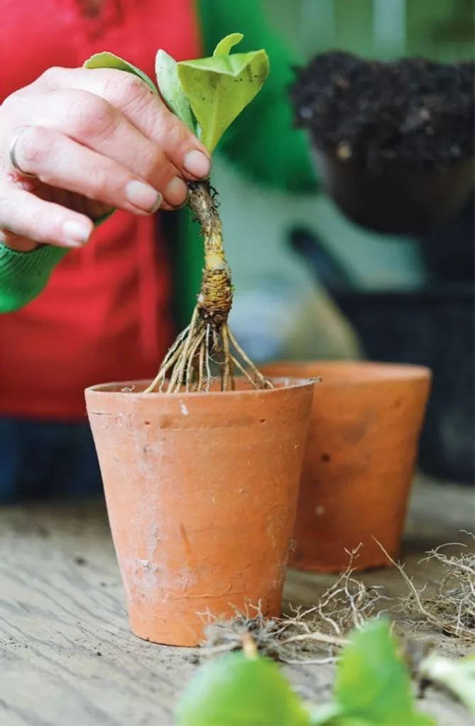 - Выкопайте (достаньте) растение из грунта, стараясь не сильно повреждать корни. Аккуратно разделите растение, чтобы каждая часть имела корни и побег. Разделяйте отдельные растения пальцами (отделять гораздо легче, если корни смочить водой).Удалите старые части, сухие, мягкие.