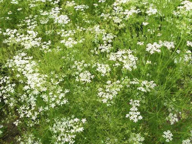 Кервель цветет в мае-июне. Цветки мелкие, белые, собраны в зонтичные соцветия. Листья и цветы съедобны – их используют как пряность (добавляют к супам, салатам, тушеному мясу, морепродуктам, блюдам из яиц).