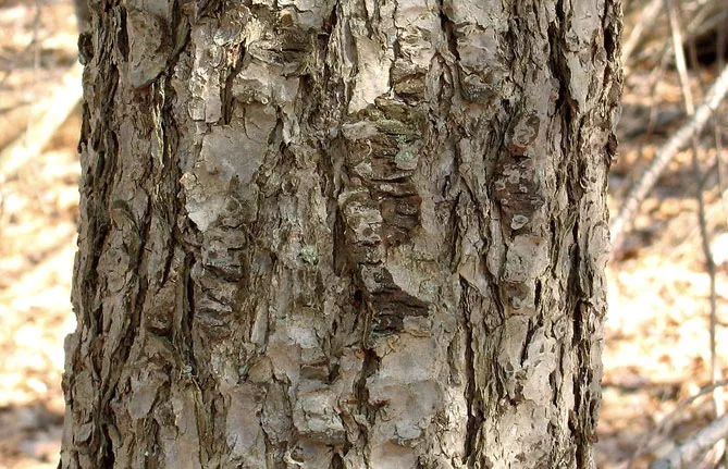 - Ствол, кора. Растение имеет прямой цилиндрический ствол с молодой гладкой серой корой с очень пахучими смолистыми волдырями. С возрастом кора становится губчатой и огнеупорной, достигает толщины 30 см, а на ее сером фоне видны вертикальные красно-коричневые трещины.