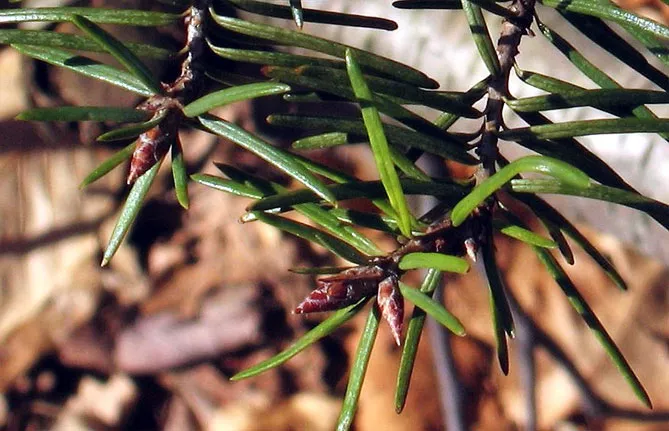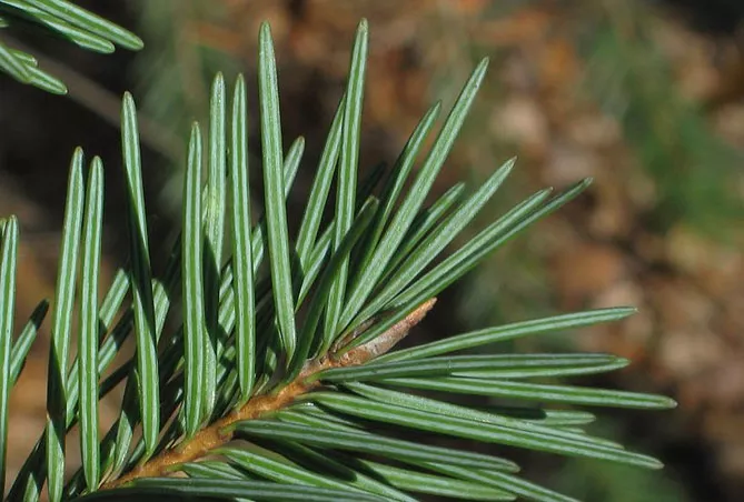 - Хвоя. Вечнозеленые темно-зеленые или голубоватые иголки в зависимости от разновидности распределяются по обеим сторонам ветки более или менее противоположным образом, часто в виде кисти по всей ветке (у карликовых сортов). Хвоинки узкие, уплощенные, гибкие, неколючие, с небольшим сужением в основании и с 2 четкими линиями на тыльной стороне. Их длина варьируется от 2 до 4 см при ширине 1 мм. При их растирании можно почувствовать приятный фруктовый аромат, который некоторые называют лемонграссом, другие – яблоком. Опадание хвои оставляет на ветке грубые рубцы.