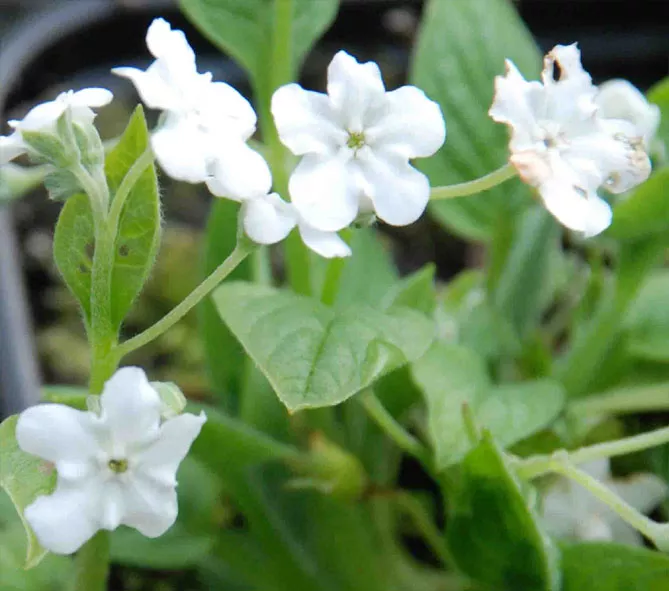 Сорт пупочника весеннего «Альба» (Omphalodes verna Alba) – чисто белый, цветет с марта по май. Высота – 20 см. Сорт, со слегка рельефной, опушенной листвой. Очень яркое растение в тени.