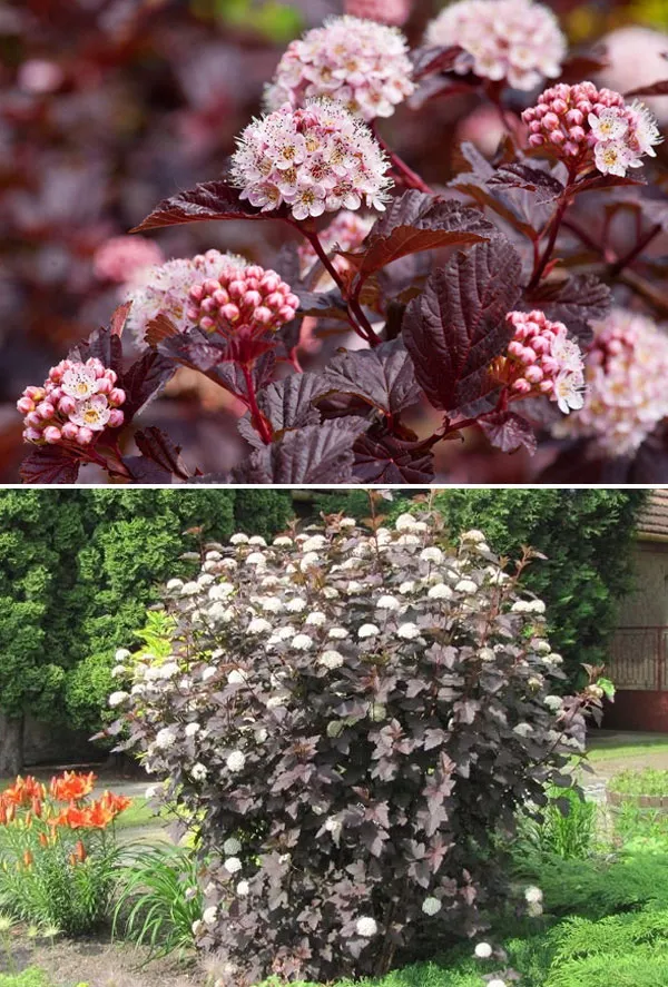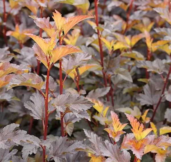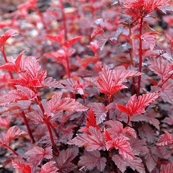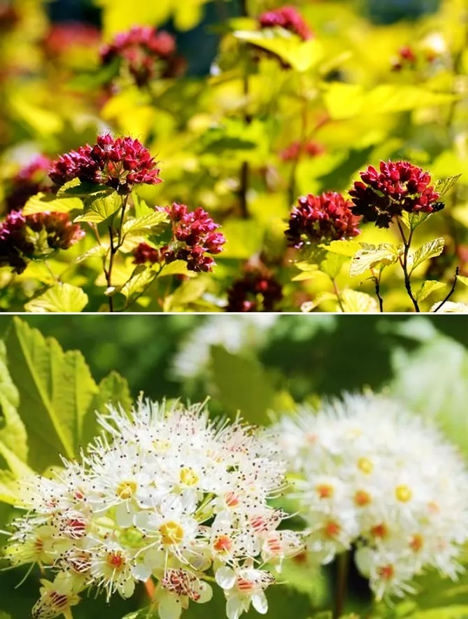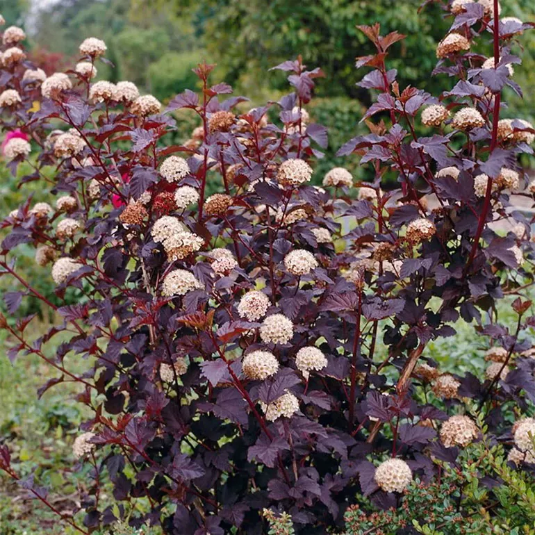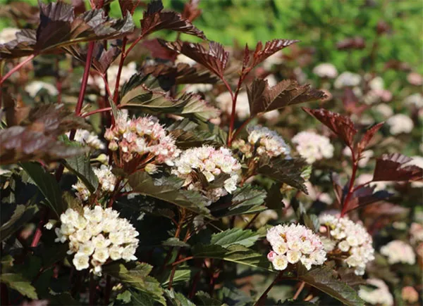 - «Самме вайн» Summer Wine – невысокий, шаровидной формы, компактный сорт с белыми цветками, появляющимися с июня по июль; высота куста – 2 м; весной листья становятся темно-пурпурными, осенью красновато-коричневыми;