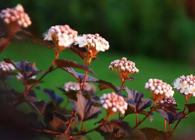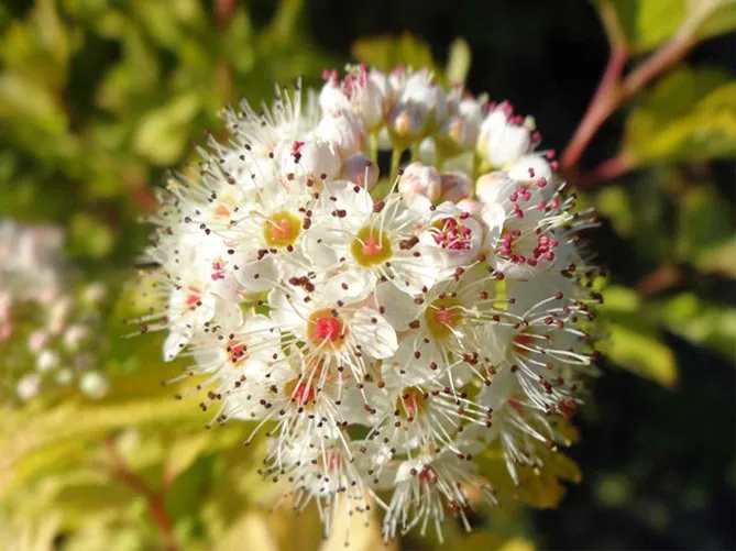 Когда цветет пузыреплодник? Поздней весной (май – начало июня) на побегах появляются мелкие, белые или розовые цветки, собранные в небольшие соцветия, выглядящие пушистыми из-за сильно выступающих тычинок. Цветки не особенно декоративны, хотя у некоторых сортов контраст, который они создают с листьями, значительно повышает их декоративную ценность.