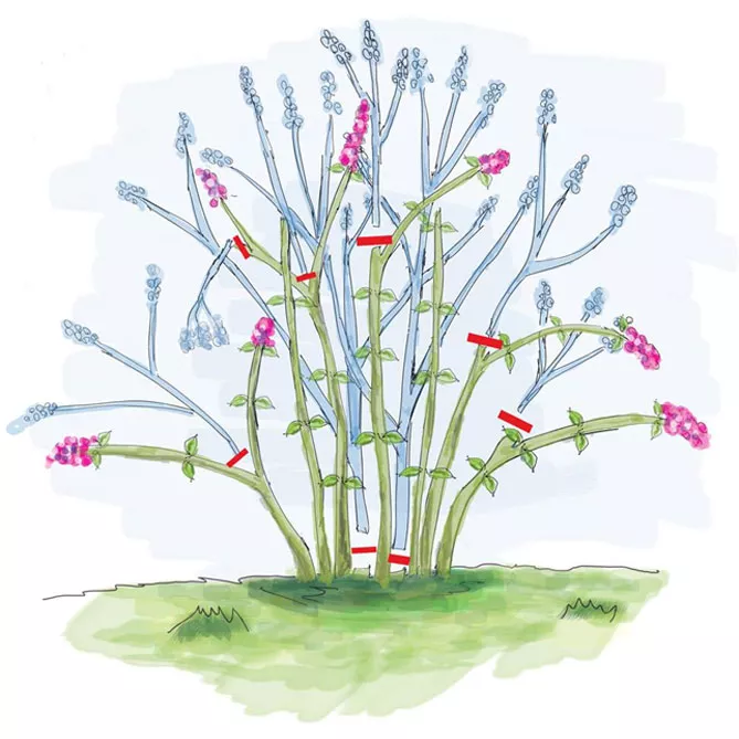 Фото. Схема обрезки пузыреплодника после цветения. Укоротите отцветшие побеги на треть: чуть выше ветвления или чуть выше сильного побега или боковой почки, направленной наружу куста.