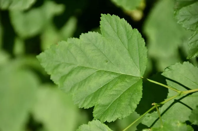 - Листья одиночные, имеют много прожилок, лопастные, с шаровидными краями. Осенью листва окрашивается в бледно-желтый цвет, затем опадает. Листья на одном кустарнике могут немного отличаться друг от друга. На сильных новых побегах они крупнее, крепче, молодые листочки более мелкие, с менее очерченными лопастями.