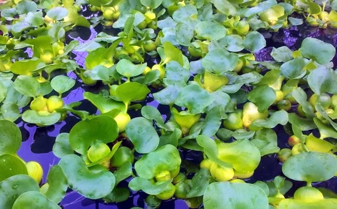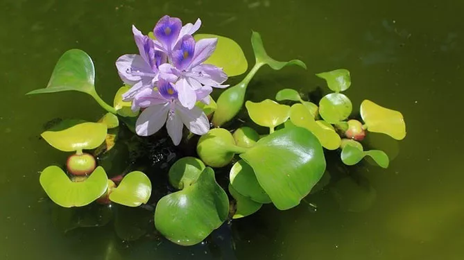 Плавающий водяной гиацинт или эйхорния толстоножковая (Eichhornia crassipes) чрезвычайно декоративен и прост в уходе. У него мясистые, зеленые листья, а когда температура воды в сезон превышает 24 °С, образуются пурпурные соцветия. Водяной гиацинт не зимует в прудах, но широко доступен и недорог.
