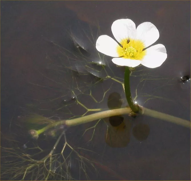 Цветы на длинных стеблях растут над поверхностью воды. Лепестки белые с желтым основанием. Длинные волоски покрывают основание цветка. Период цветения: май-август Высота: 10-50 см. Под водой цветки закрываются, а над поверхностью воды раскрываются и опыляются жуками и мухами.