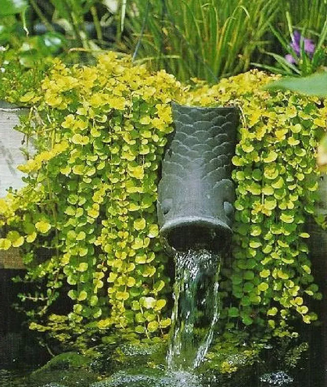 Классическое почвопокровное растение – вербейник монетный (Lysimachia nummularia). Его побеги могут достигать 50 см в длину, прекрасно маскируя края водоема. Имеет маленькие желтые цветы. Период цветения: июнь-август. Ему нужно обеспечить защищенное от солнца место.