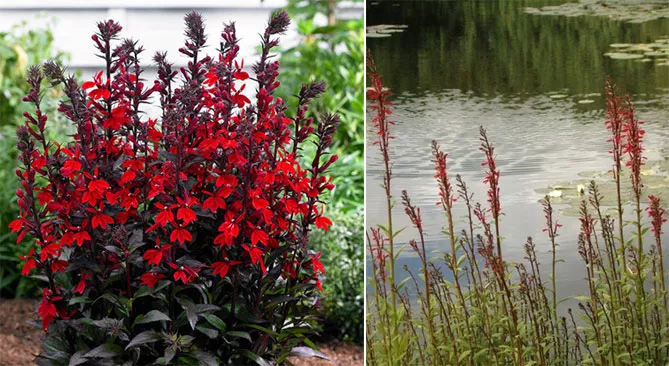 Растение из семейства Колокольчиковые Лобелия пурпурная (Lobelia cardinalis) вырастает до 90 см в высоту. Листья зеленые, продолговато-яйцевидные, заостренные, ланцетные. Блестящие красные цветки формируются в кистевидном соцветии, большей частью направлены в одну сторону. Цветет с июля по октябрь. В естественных условиях произрастает на влажных лугах, у берегов водоемов. Красивое растение, бросающееся в глаза издалека.