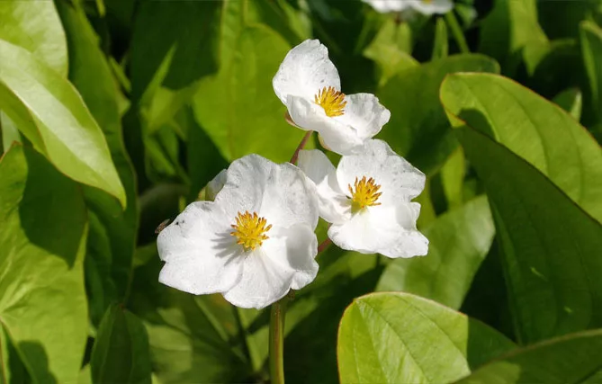 Одно из самых популярных растений, украшающих пруд – Стрелолист широколистный (Sagittaria latifolia). У него маленькие цветки с желтыми тычинками и широкими листьями. Обычно он растет на глубине 20-30 см, в некоторых случаях – даже на метровой глубине.