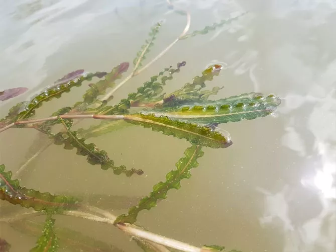 Вид подводного растения Рдест курчавый (Potamogeton crispus) имеет листья с волнистыми краями, насыщающие воду кислородом и очищающие ее от вредных химических веществ, например, нитратов. Похож на водоросли.