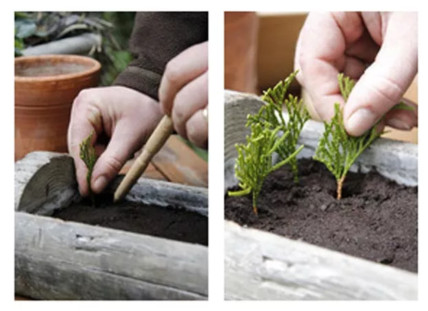 В конце лета или начале осени укорененные черенки пересаживают в отдельные горшки. Перед зимой горшки закапывают в землю или утепляют корой и помещают в укромное место для защиты от мороза. Молодые хвойные саженцы, посаженные непосредственно в землю сразу после образования корней, подвергаются воздействию слишком сухого воздуха, заглушению сорняками, что может вызвать их гибель.