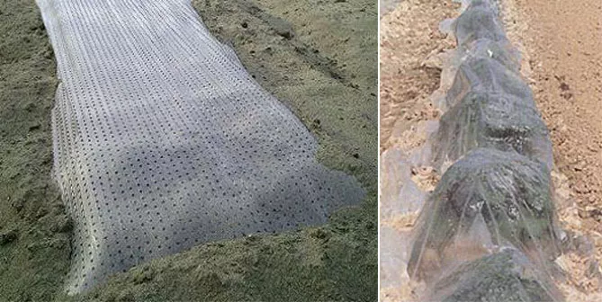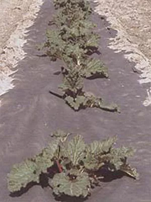 Независимо от вида покрытия, почву желательно мульчировать черной пленкой или нетканым материалом (Фото), препятствующими росту сорняков и ограничивающими испарение воды. Края материала, используемого для мульчирования, засыпают землей, а над появляющимися листовыми почками вырезают отверстия. Плантацию укрывают и мульчируют весной, как только оттаявшая почва позволяет покрыть края используемых материалов. Растения остаются укрытыми до первого урожая (обычно 4 недели).
