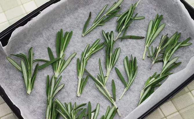 Розмарин можно сушить в подвешенном состоянии, предварительно связав пучки из нескольких стеблей. Помещение должно быть теплым, хорошо проветриваемым. Для «принудительной» сушки в сушильных приборах следует помнить, что температура не должна превышать 35 °C.