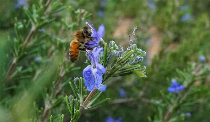 Розмарин цветет ранней весной. С апреля по июль, а иногда и дольше, куст покрывается голубыми или розовыми цветами. Сильные ароматные цветы привлекают пчел, которые превращают нектар в ценный розмариновый мед. Плод растения – орешек.