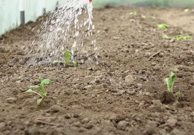 - После посева борозды выравнивают, почву слегка уплотняют и тщательно поливают каждый ряд. При посеве в апреле грядку следует накрыть агроволокном, семенам для прорастания необходимо тепло. Оптимальная температура почвы для прорастания рукколы не ниже +10°С. При температуре воздуха +20°С первый урожай рукколы возможен уже через 6 недель после посева. Также можно посеять рукколу в марте в парник или теплицу, что сократит время ожидания урожая.