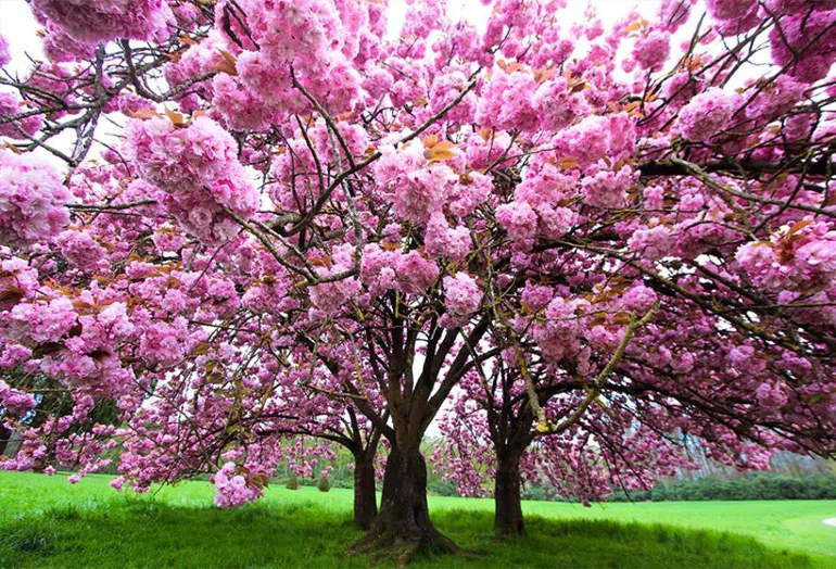Один из самых распространенных сортов сакуры (вишни мелкопильчатой) – «Канзан» (Prunus serrulata Kanzan) цветет с апреля по май. Высота – 6 м. Дерево с вертикальной прямостоячей кроной. Весной покрывается множеством махровых цветков насыщенно-розового цвета. Молодые листья имеют привлекательный бронзовый оттенок.