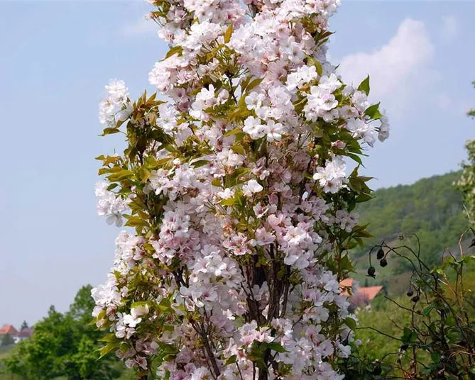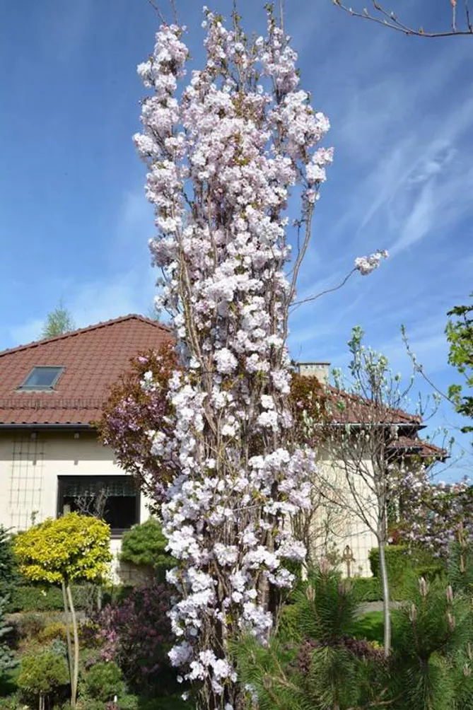 Сорт вишни мелкопильчатой «Аманогова» (Prunus serrulata Amanogawa) цветет с апреля по май. Высота – 7 м. Это японское вишневое дерево выделяется вертикальной формой. Весной цветет нежными ароматными розовыми цветами. Листья осенью приобретают красивую окраску.