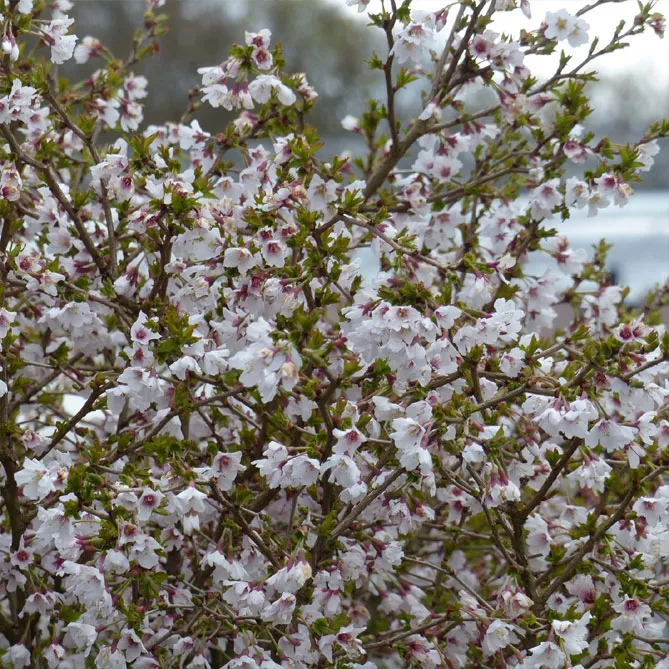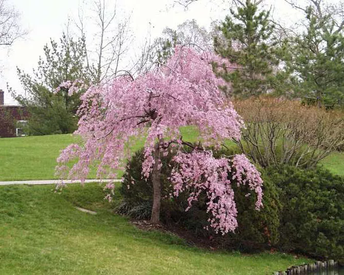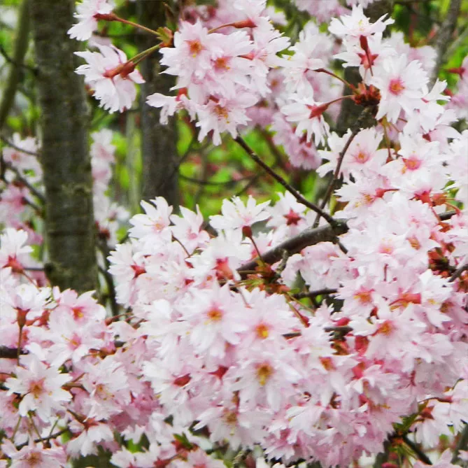 Высокорослая вишня косматая «Отумналис Розеа» (Prunus subhirtella Autumnalis Rosea) может иметь высоту около 5 м. Цветет в конце марта множеством нежно-розовых полумахровых цветов.
